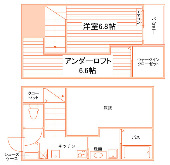 独立洗面化粧台/セパレート(バス・トイレ)/洗濯機置場(室内)/追焚き機能付バス/温水洗浄便座/ガスコンロ(2口)/システムキッチン/バルコニー/フローリング/ロフト/収納/シューズケース/インターフォン(TVモニター付)/エアコン/個別給湯(ガス) |