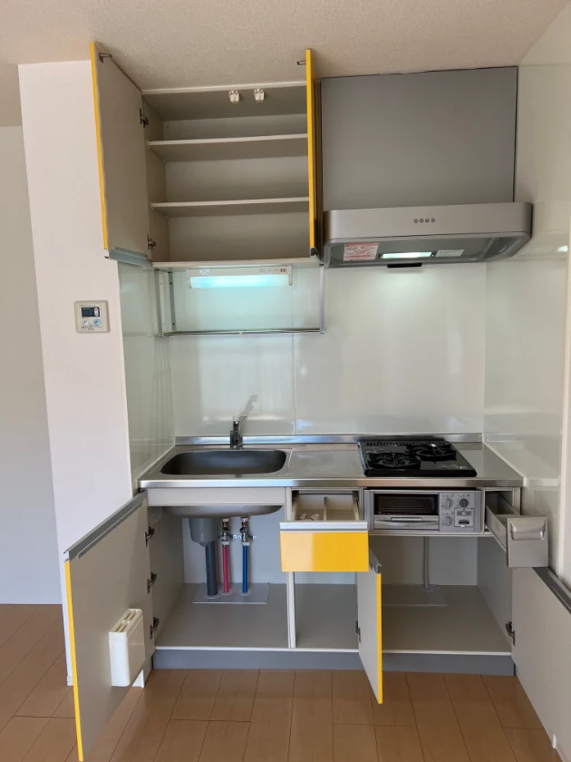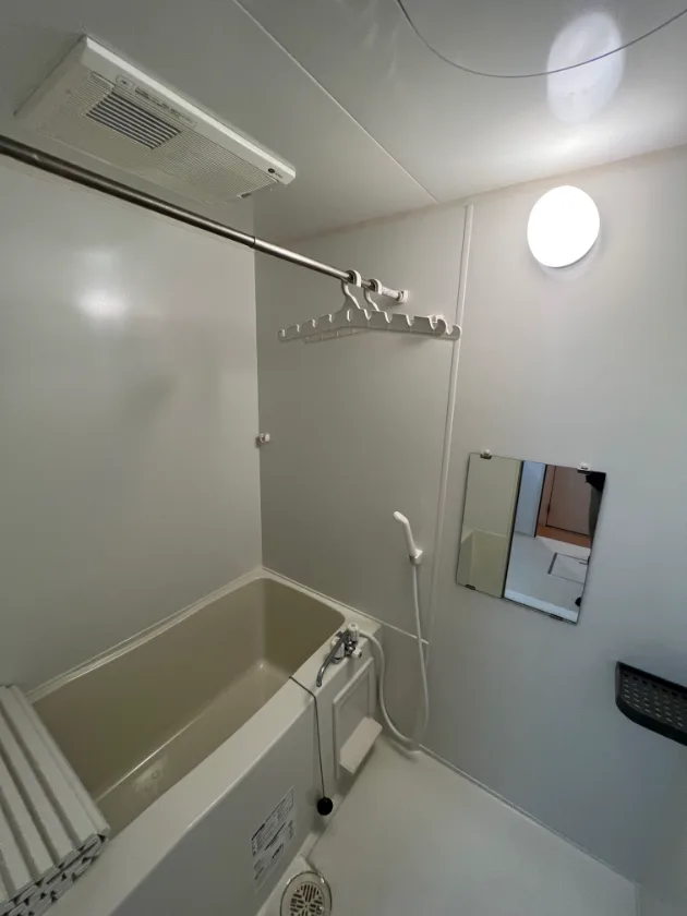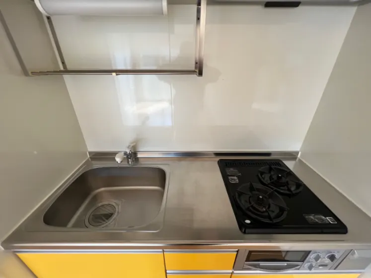 独立洗面化粧台やグリル付コンロ、室内物干しもついた設備充実の1LDKタイプ物件です