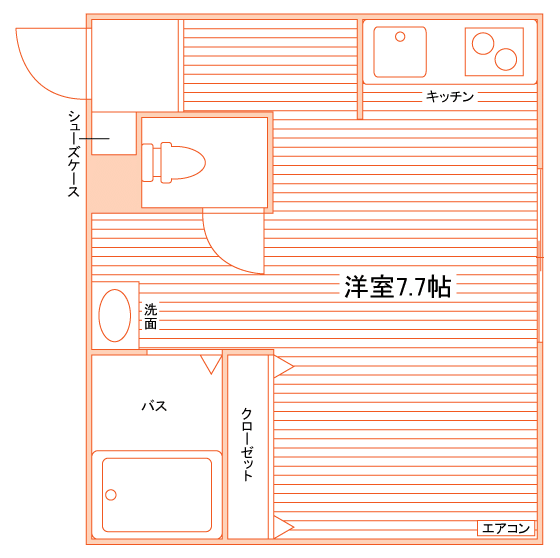 独立洗面化粧台/セパレート(バス・トイレ)/洗濯機置場(室内)/温水洗浄便座/ガスコンロ(2口)/居室照明器具/フローリング/収納/シューズケース/インターフォン(TVモニター付)/ダブルロックキー/エアコン |