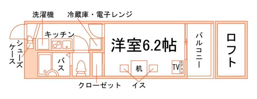 セパレート(バス・トイレ)/洗濯機/洗濯機置場(室内)/浴室乾燥機/温水洗浄便座/RHコンロ(2口)/家具家電付/冷蔵庫/居室照明器具/電子レンジ/ロフト/バルコニー/シューズケース/収納/インターフォン(TVモニター付)/エアコン/個別給湯(ガス) |