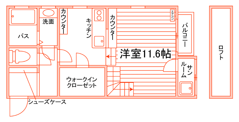 独立洗面化粧台/セパレート(バス・トイレ)/洗濯機置場(室内)/暖房便座/温水洗浄便座/IHコンロ(2口)/居室照明器具/ロフト/サンルーム/収納/シューズケース/WINクローゼット/インターフォン(TVモニター付)/エアコン/個別給湯(ガス) |