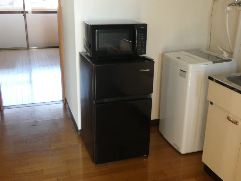 セパレート(バス・トイレ)/ユニットバス(一部セパレート)/洗濯機/洗濯機置場(室内)/温水洗浄便座/ガスコンロ(持込)/家電付/冷蔵庫(2ドア)/電子レンジ/フローリング/バルコニー/収納/インターフォン(TVモニター付)/暗証番号式キー/エアコン |