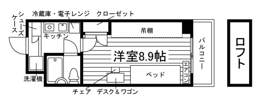 セパレート(一部ユニットバス)/洗濯機置場(室内)/温水洗浄便座/IHコンロ(1口)/家具家電付/居室照明器具/フローリング/ロフト/収納/インターフォン(TVモニター付)/暗証番号式キー/エアコン/個別給湯(ガス) |