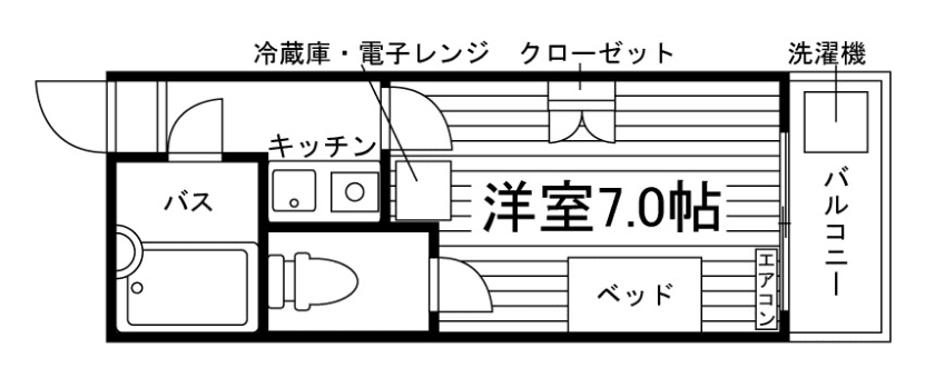 ユニットバス/セパレート(バス・トイレ)/洗濯機置場(室外)/IHコンロ(1口)/家具家電付/居室照明器具/バルコニー/収納/インターフォン/暗証番号式キー/エアコン |