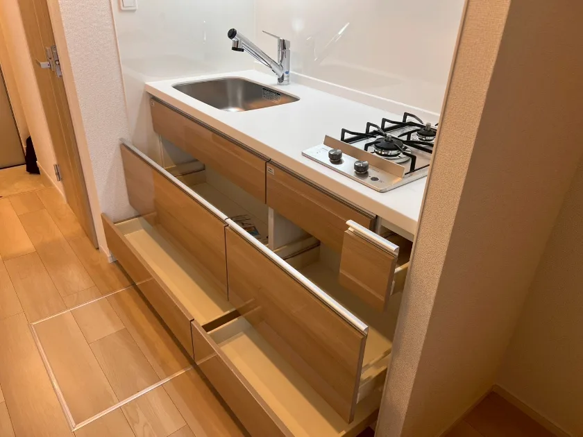 セパレート(バス・トイレ)/独立洗面化粧台/追焚き機能付バス/温水洗浄便座/浴室乾燥機/ガスコンロ(2口)/システムキッチン/フローリング/複層ガラス/収納/シューズケース/インターフォン(TVモニター付)/ダブルロックキー/エアコン |