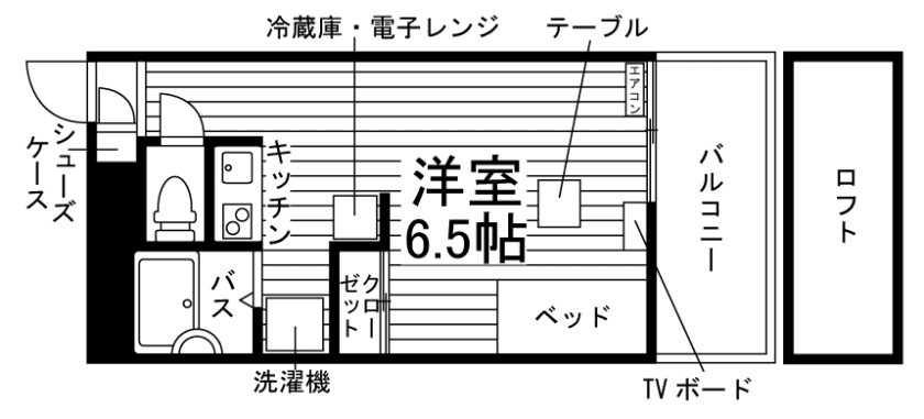 セパレート(バス・トイレ)/洗濯機置場(室内)/洗濯機/IHコンロ(2口)/家具家電付/冷蔵庫(2ドア)/電子レンジ/ロフト/バルコニー/収納/インターフォン/エアコン |