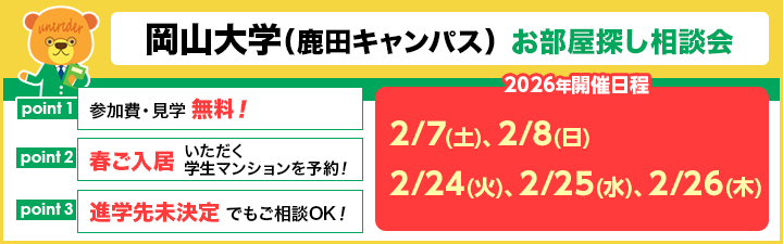>>岡山大学(鹿田キャンパス)に通学便利なマンションアパートはコチラ