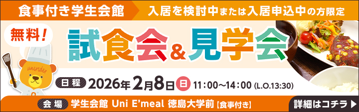 【徳島大学】ご進学予定の皆様へ、朝夕2食付き学生マンションが合格発表前予約受付中です