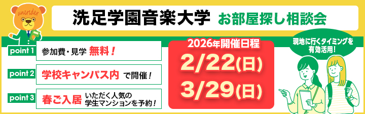 洗足学園音楽大学へ進学予定のみなさまへ、徒歩又は自転車でご通学可能、全室家具家電付き、ネット無料の女子専用学生マンションをご紹介します。