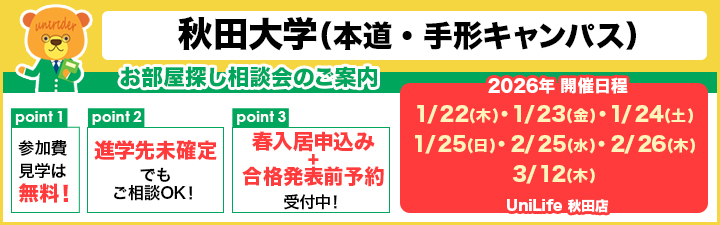 >>秋田大学(本道キャンパス)に通学便利なマンション・アパートはこちら